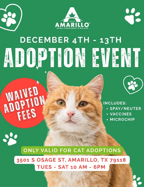 The City of Amarillo Animal Management and Welfare Department (AAMW) is waiving cat adoption fees beginning Thursday (December 4) through December 13.