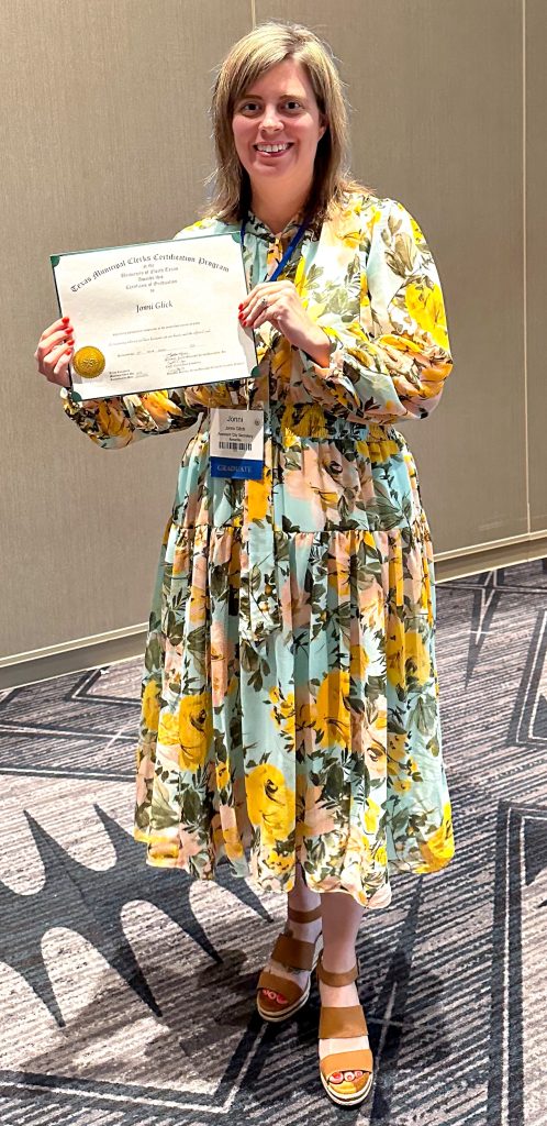 Glick recently graduated from the Texas Municipal Clerks Certification Program from the University of North Texas in Denton.